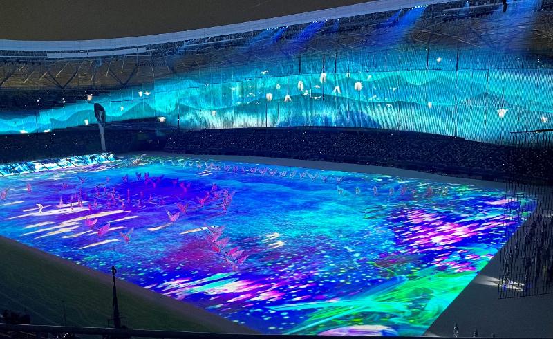 接下来,线幕和地面投影营造出全景沉浸式的海底世界。激光掠过,中国空间站和宇航员在太空中遨游。科学家指挥机器人跳起机械舞,在激光的配合下,观众目光所及之处,尽是一场科技感和未来感的视觉盛宴。