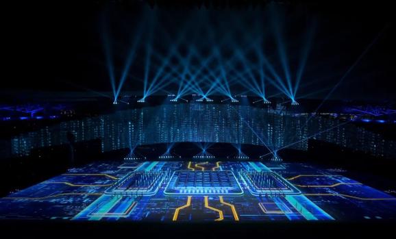 “可上九天揽月,可下五洋捉鳖”从逐梦深蓝到砺剑长空,从中国制造到中国创造,从追赶跟跑到超越领跑,大国重器凝结着中国人民砥砺奋斗、自主发展的智慧成果。“蛟龙”潜海、“嫦娥”奔月、“天问一号”……国家重大科技成就中也浸透了陕西科技力量的贡献。这时,演员与空中线幕、地面投影、道具互动组成巨大的立体芯片和“秦创原”造型。