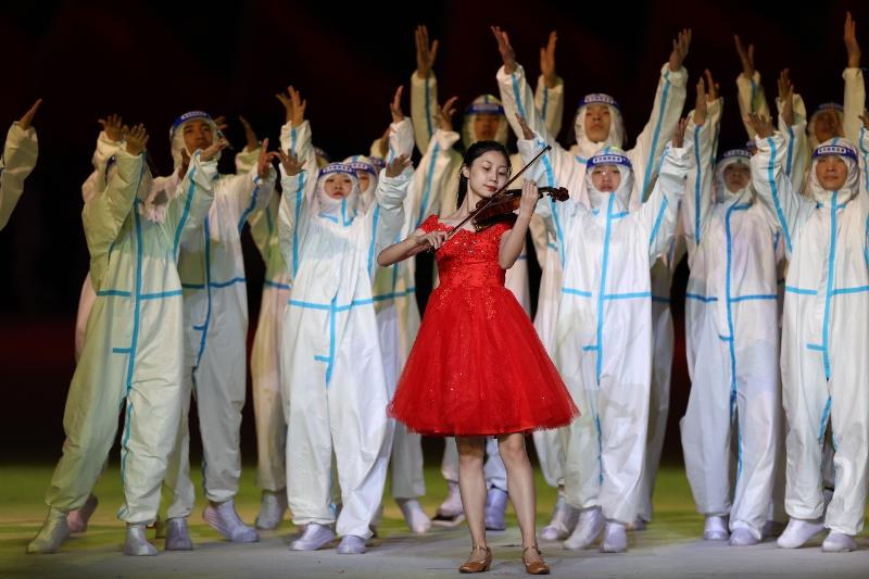 爱国,是人世间最深沉、最持久的情感。各行各业的代表,表演出包括抗击新冠疫情在内的、最动人的典型职业形象,唤醒全场观众内心最柔软处的情感记忆。此时,一个身着中国红的小姑娘在舞台中央用小提琴奏响《我爱你,中国》,通过地面立体投影,中国红逐渐渲染开来,一幅巨大的红旗在舞台中央展开。所有人双手捧起这面凝集了十四亿多中国人梦想与希望的旗帜。