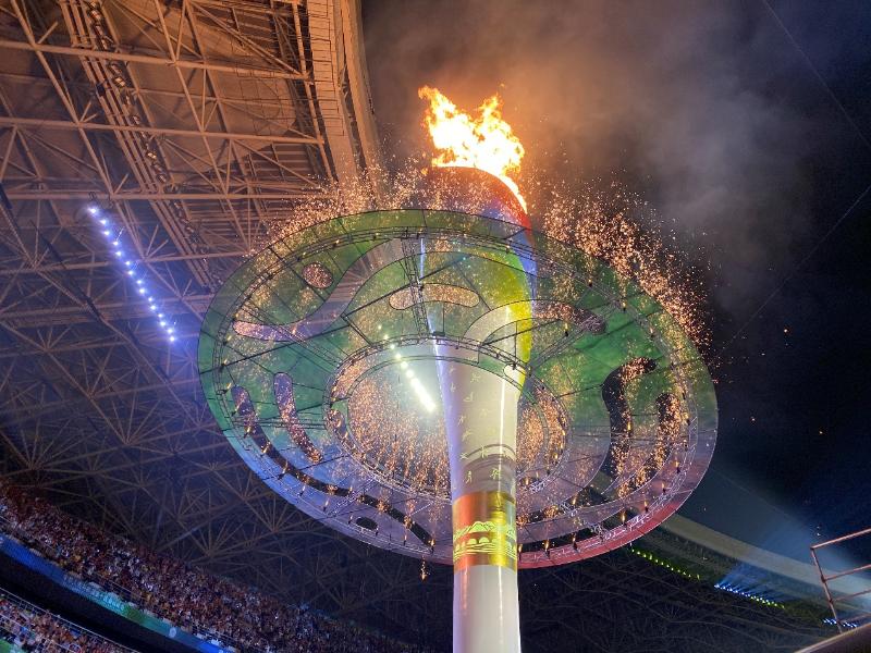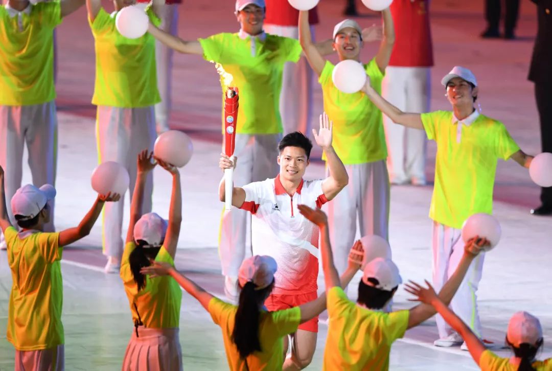 万众瞩目下,苏炳添、张雨霏、秦凯、郭文珺、马龙等5位火炬手接力传递,最后由东京奥运会首枚金牌获得者杨倩点燃全运会主火炬。