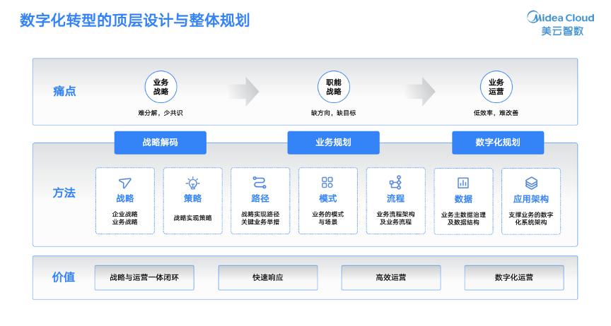 在这方面,美的有一套成熟“方法论”:首先整体评估企业数字化现状,包括研发、营销、供应链、财务、人力等各个领域,然后针对薄弱环节,结合IT能力和业务需求,提出针对性的解决方案,作为顶层设计的依据与参考。