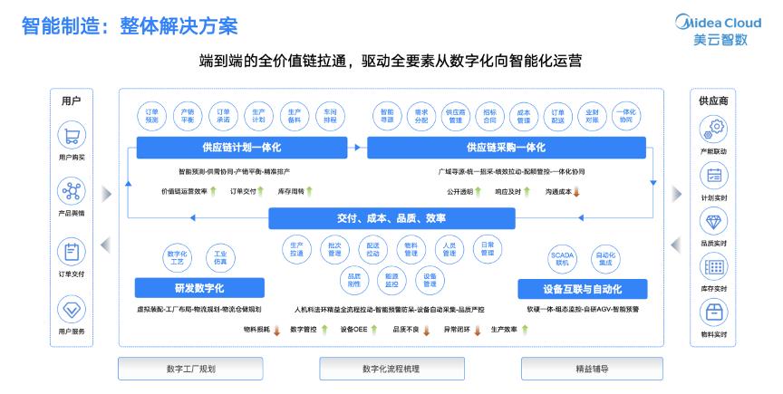 美的智能制造不仅仅是工厂里的智能制造、产线的自动化,还包含从用户洞察开始,从产品研发创新、计划采购一体化、供应商协同到柔性制造。