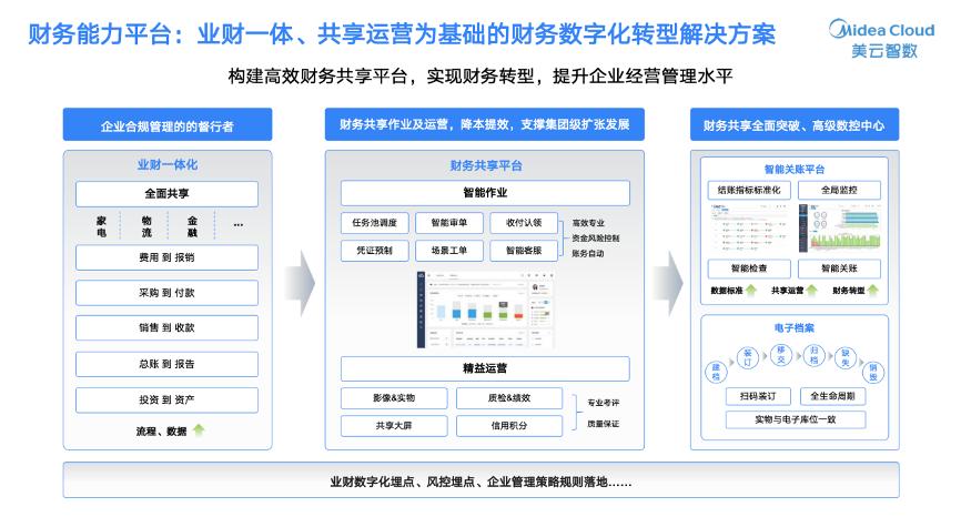 美的财务是一体化管理,打造以业财一体、财务共享为核心,涵盖预算、费用、采购、销售、核算、资金、税务、自主经营等业务,实现了全业务、全流程的全价值链财务解决方案。
