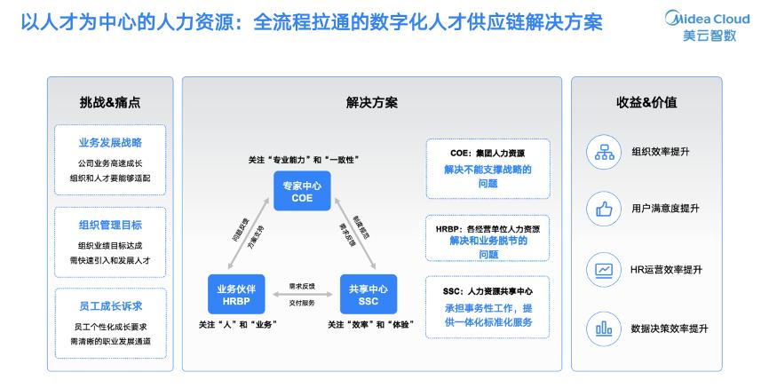 美的是怎么去做人力资源管理呢?我们称之为“三支柱”方案:专家中心、人力资源共享中心和HRBP。从员工和业务维度出发构建数字化人才供应链,聚焦管理者、员工、HR三个角度,将不同业务场景中的HR数据无缝连接,高效支撑企业数字化转型。