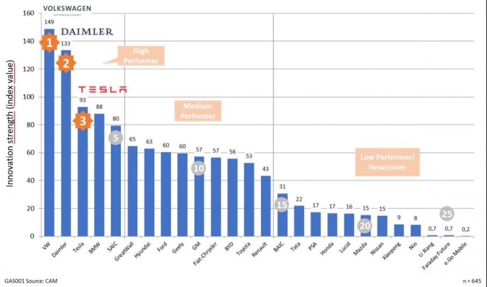 在德国汽车市场研究机构汽车管理中心最新发布的“2021全球车企创新排行榜”的“TOP5”榜单上,我们可以看到,今年表现尤为亮眼的中国上汽集团实现了最大飞跃,从第23名跨至第5名。