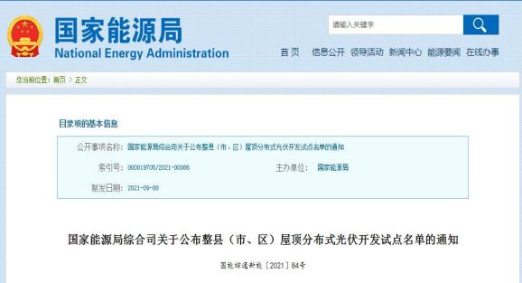 今年6月,我局印发了《国家能源局综合司关于报送整县(市、区)屋顶分布式光伏开发试点方案的通知》(以下简称《通知》)。目前,各省(自治区、直辖市)及新疆生产建设兵团均已按《通知》要求报送了试点方案。现将各地报送的试点县(市、区)名单予以公布,并就有关事项通知如下: