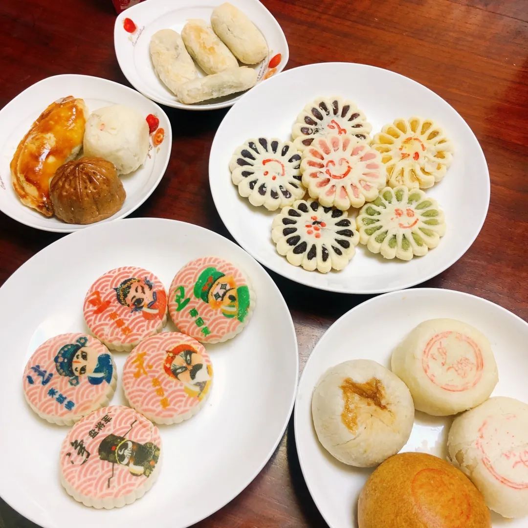 左图:稻香村点心(上盘:小牛舌饼,中左侧盘:肉饺子、眉宫饼、文玩核桃,中右盘:紫金花开,下左盘:京剧系列点心,下右盘:现烤鲜肉月饼)。