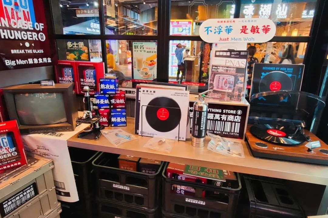 在北京西大望路合生汇的这家门店便特别设置了一个复古潮流区域,称之为“敏华包罗万有商店”。这里售卖的文创产品有食用盒、黑胶唱片、灭火筒、T恤衫,此外还有黑色易拉罐包装的敏华咖啡、敏华奶茶和敏华柠檬茶,和正红色和正蓝色的餐巾纸,包装上白色繁体大字写着“吸油纸”“熬夜纸”“解忧纸”或“内卷纸”。可以说,敏华冰厅迎合了当代年轻人最感兴趣的文化消费需求,以“网红”景点的方式打造零售区域。这种从装潢到餐食的统一复古风,除了对商场里觅食的食客而言是一种审美优势,更吸引社交媒体上的网友慕名前来打卡。