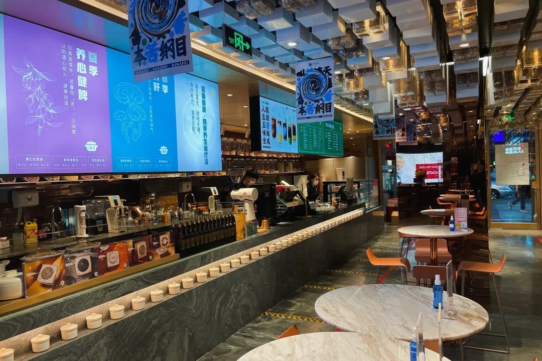 走进一号店,一层是咖啡厅般的装潢。落座后店员会提供由罗汉果、橘皮、玫瑰等食材做成的去火茶。随后你便可以在丰富的菜单中挑选合口味的咖啡了。龙眼气泡美式、陈皮拿铁、人参冷草特调……我们熟悉的饮品单上加入了中草药的原料,大胆又有趣,不得不佩服同仁堂的创意。最受欢迎的五款苦调饮品是知嘛健康与淘宝造物节的联名,其中竹炭黑芝麻拿铁香浓丝滑,穿心莲美式竟然苦中带甜。