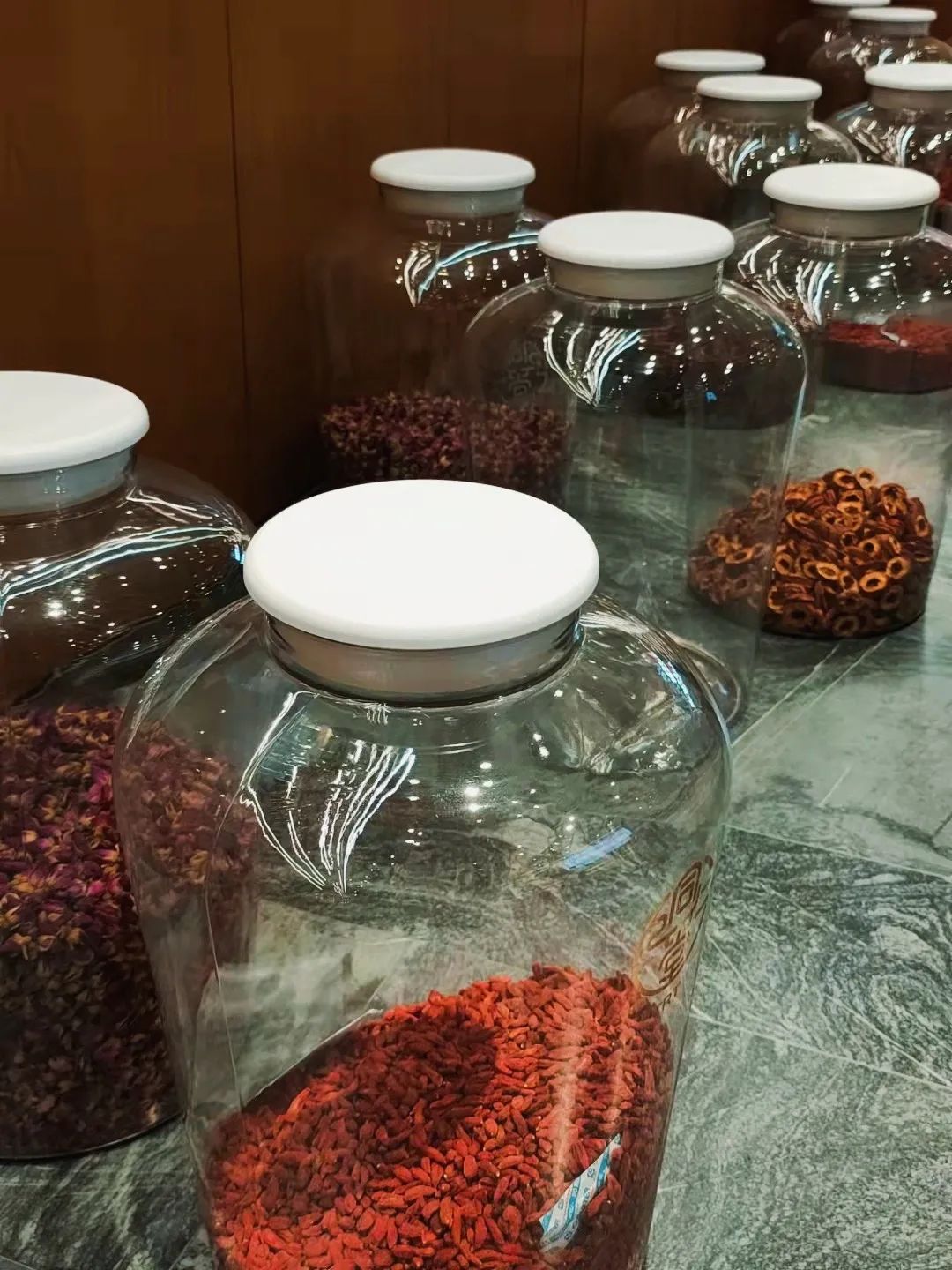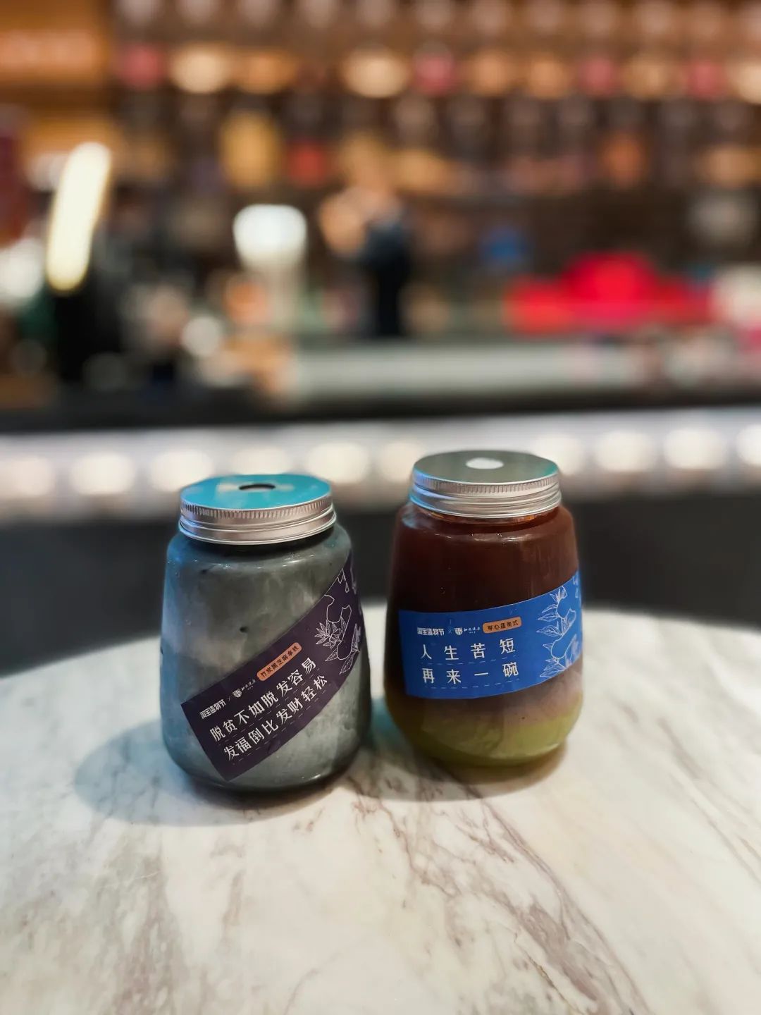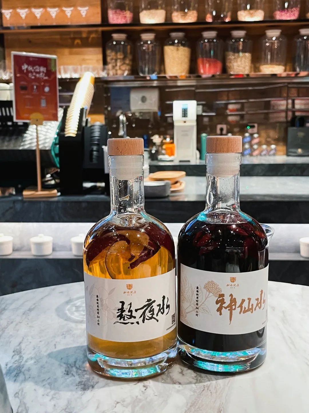 另外一个有名的系列是玻璃瓶装饮品,玻璃瓶中可以清晰看到漂浮着的药材,颜值和养生效果俱佳。其中熬夜水的成分有人参片、贡菊、大枣、罗汉果和蜂蜜,这些成分有补气护肝的功效,能帮助熬夜党对抗疲劳;而神仙水的原料是红参片、桃胶、大枣、枸杞、桑葚、龙眼和葡萄干,养阴补血,是一款适合女性的滋补佳品。