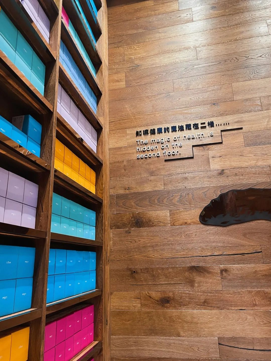所以,在一号店一层的一旁,还是满墙的传统同仁堂保健商品和装在玻璃罐中贮存的补品。而走入一号店的二层就闻到厚重的中草药香气,肩颈按摩海报、名医工作室和满墙的传统中医药箱,说明同仁堂的老本行还是最核心的业务。正如店内slogan所写,“一层只是序曲,二层才是正章”。