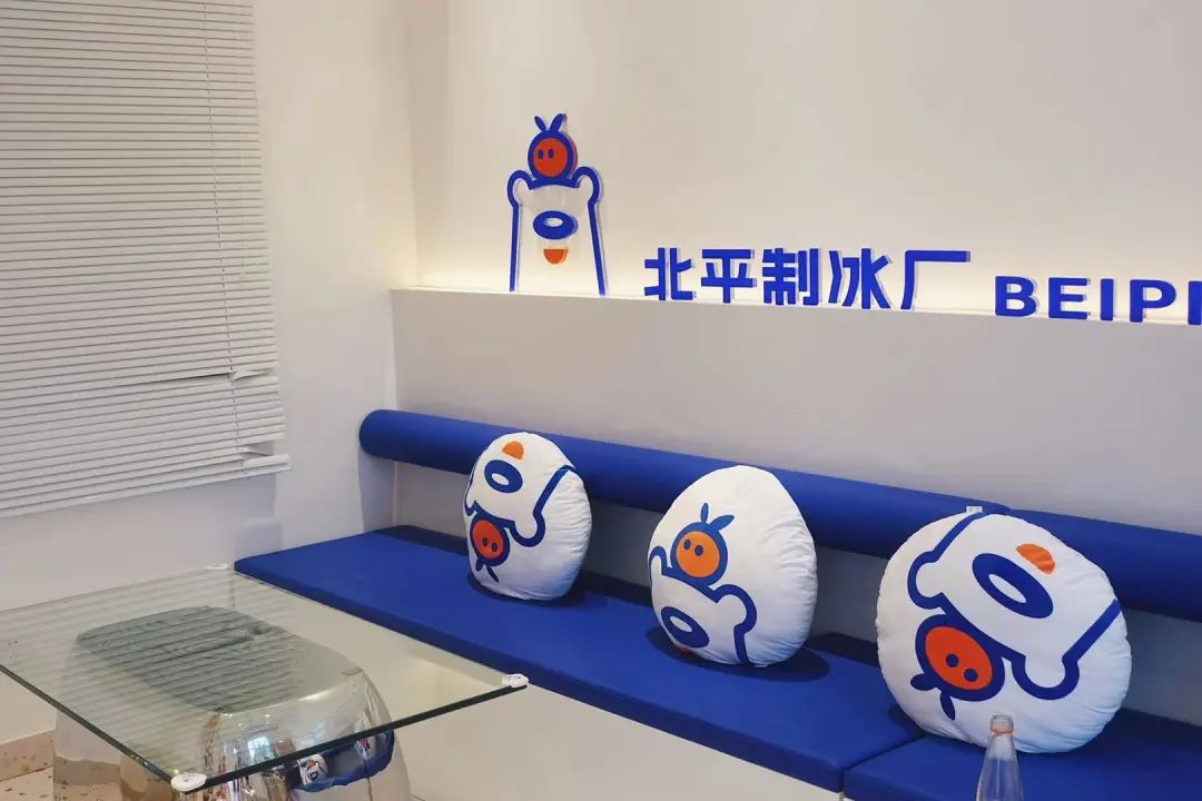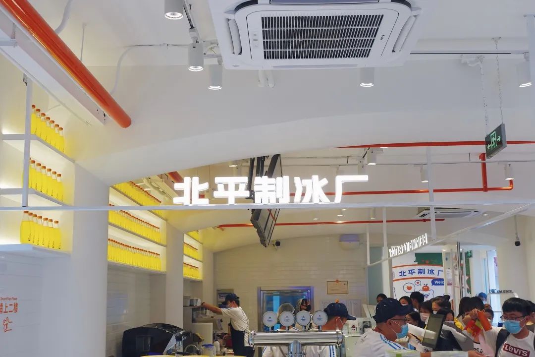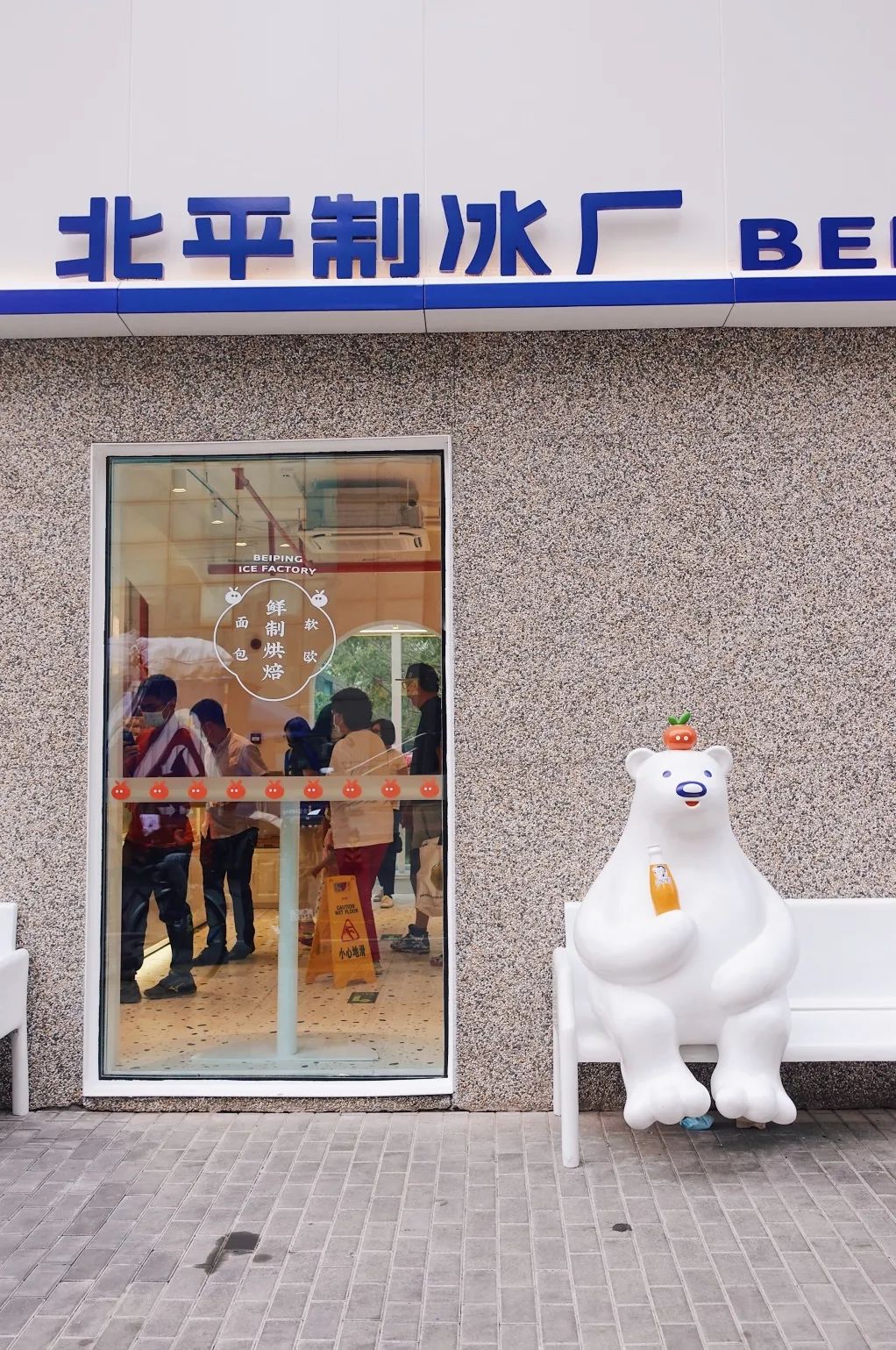 新开的北冰洋体验店北平制冰厂是一个装潢简单的两层小楼,门口一排齐人高的坐姿北极熊雕塑成为了它的特征。进入商店,两层共300平米的宽阔空间可以容纳下往来不绝的人群。在2021年的夏天这个由老牌汽水公司北冰洋创办的全新零售空间登陆海淀区花园路,这里是早年间北冰洋工厂的所在地。老汽水厂旧址上建造的网红文创店,与这家拥有近80年的本地企业“绝地逢生”的转型甚至还有些象征性的呼应。