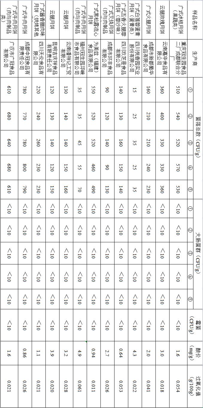 标识企业为福州冠生园邛崃市食品有限公司、四川悦香园实业股份有限公司、昆明吉庆祥食品有限责任公司的月饼样本的酸价实测值较高;