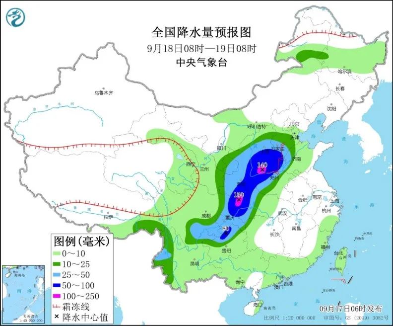 9月18日08时至19日08时,西北地区东部、华北南部、西南地区东部、黄淮西部、江汉西部、江南西北部等地的部分地区有大到暴雨,其中,陕西南部、山西南部、四川盆地东北部、河南西部等地局地有大暴雨(100~150毫米)。河北南部、河南北部等地的部分地区有4~6级风。