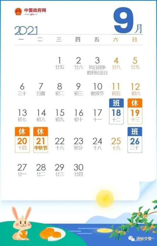 2021年中秋节放假安排:9月19日至21日放假调休,共3天。
