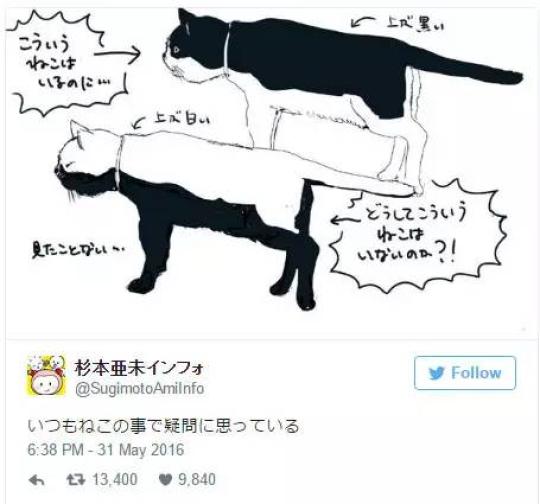 最近,一位Twitter上的网友提出了问题:为啥黑白猫都是后背黑,肚皮白?后背白,肚皮黑的猫咋就没见过呢?