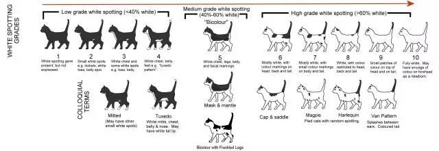 黑色素颗粒的合成与分布很大程度上是由基因决定的。对猫来说,参与决定毛色的基因有很多对,猫的毛色也是各种各样,纯色、虎纹以及白斑都比较常见,我们今天重点说说白斑基因。
