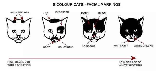 随着白斑基因表达程度的降低,猫的脸越来越黑。当白斑基因表达程度较高时,可能只有头顶有两块很小的黑色区域(图最左);当白斑基因表达程度较低时,可能只有下巴是白色的,其他地方都是黑色的(图最右)。