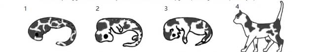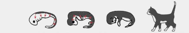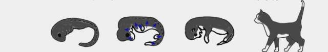 小猫开始生长了(图2)!想象一下大陆板块漂移的原理,身体渐渐长大,原来的黑色部分就互相散开了。而四肢和肚皮的细胞分裂速度更快,所以长得也更快(图3),最终呈现的结果就是:黑色毛发更多存在于猫的背侧,而白色毛发更多存在于猫的四肢与腹侧(图4)。