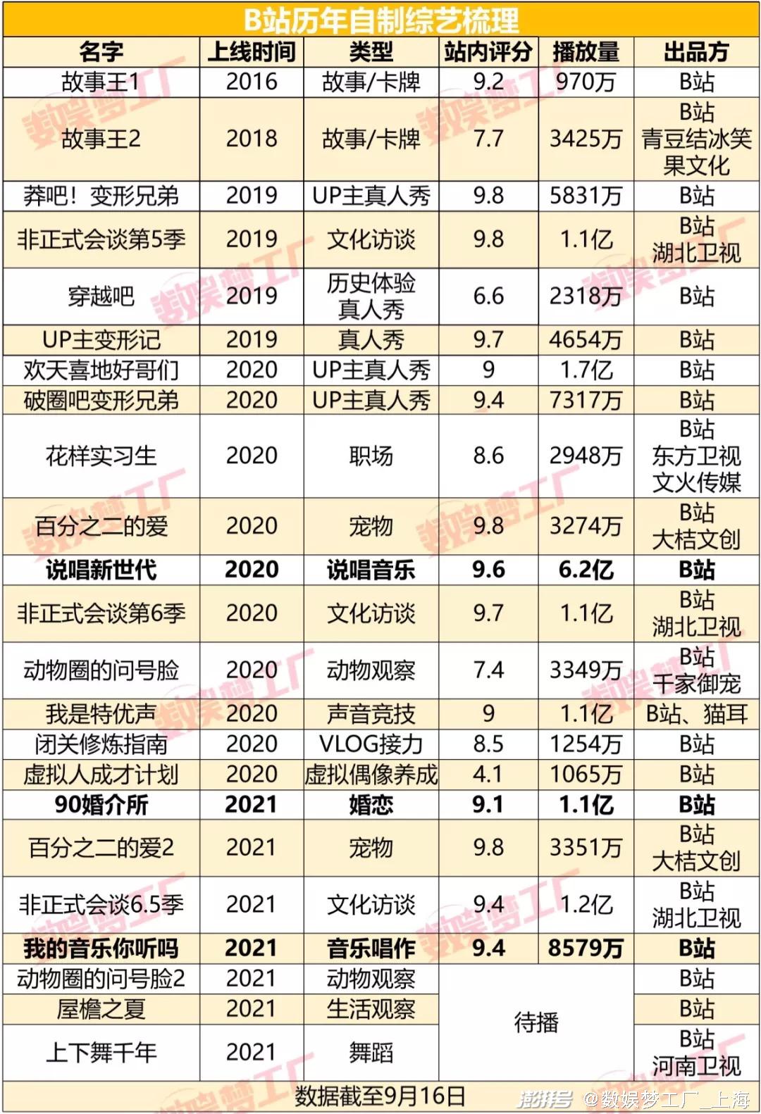 随后从2019年起,B站自制了包括《非正式会谈》第五季、第六季,《穿越吧》《花样实习生》《百分之二的爱》《动物园的问号脸》等多档综艺。