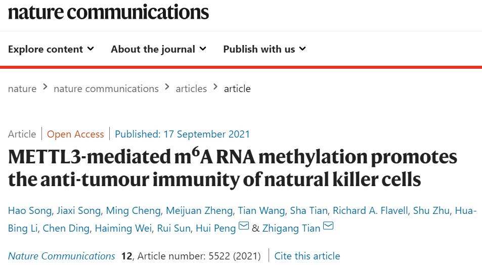 2021年9月17日,中国科学技术大学田志刚及彭慧共同通讯在Nature Communications 在线发表题为“METTL3-mediated m6A RNA methylation promotes the anti-tumour immunity of natural killer cells”的研究论文,该研究报告了肿瘤浸润性 NK 细胞中 m6A“写入器”METTL3 的表达降低,以及 METTL3 的蛋白质表达水平与 NK 细胞中的效应分子之间的正相关。