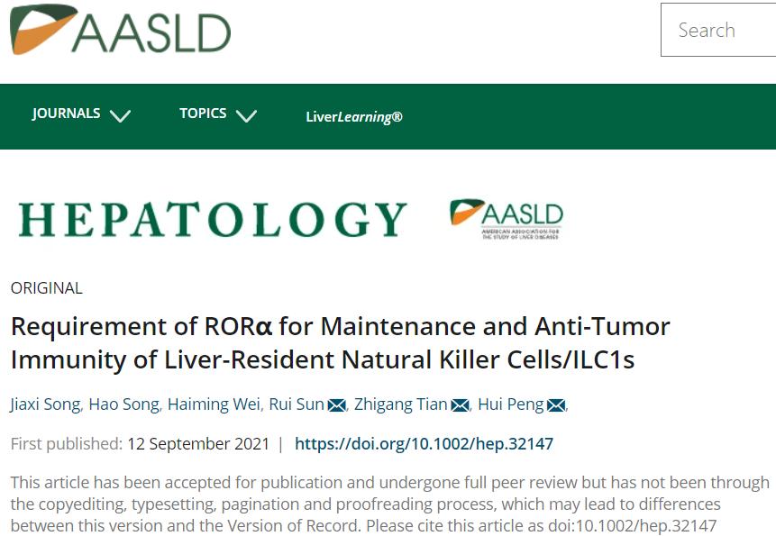 另外,2021年9月12日,中国科学技术大学彭慧,田志刚及孙汭共同通讯在Hepatology 在线发表题为“Requirement of RORα for Maintenance and Anti-Tumor Immunity of Liver-Resident Natural Killer Cells/ILC1s”的研究论文,该研究发现 RORα 在肝脏驻留 NK (LrNK) 细胞/ILC1s 中高表达。对 LrNK 细胞/ILC1s 和常规 NK (cNK) 细胞中的 Rora 进行条件消融的小鼠 LrNK 细胞/ILC1s 减少,但 cNK 细胞数量正常。RORα 缺陷的 LrNK 细胞/ILC1s 显示出增加的细胞凋亡和显著改变的转录谱。使用结直肠癌肝转移的小鼠模型,该研究发现 RORα 条件性缺陷导致更激进的肝肿瘤进展和 LrNK 细胞/ILC1 中效应分子的表达受损。因此,用 RORα 激动剂治疗有效地限制了肝转移并促进了 LrNK 细胞/ILC1s 的效应分子表达。总之,该研究揭示了 RORα 在 LrNK 细胞/ILC1 维持和功能中以前未定义的作用,为利用 LrNK 细胞/ILC1 活性治疗肝癌提供了见解。