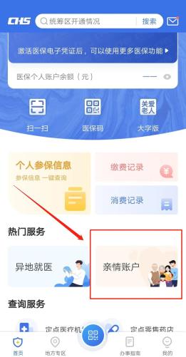 完成登录后,首页下拉找到"亲情账户",或者点击底部菜单【我的】进入个人中心页面,在【我的家庭成员】版块点击图标“+”添加亲情账户。注册用户需要绑定手机号开通医保电子凭证。