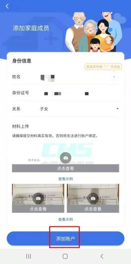 ② 上传本人户口本(常住人口登记卡)、被绑定人户口本(常住人口登记卡),点击“添加账户”即可绑定成功。
