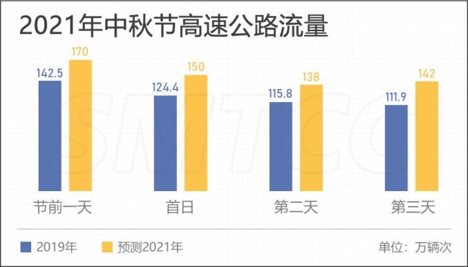 预计2021年中秋节快速路网车流总体规模达到594万辆次,日均198万辆次,较2019年同期上升20%。