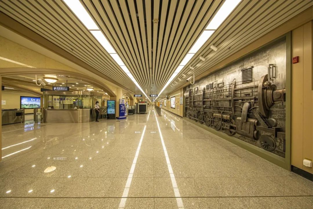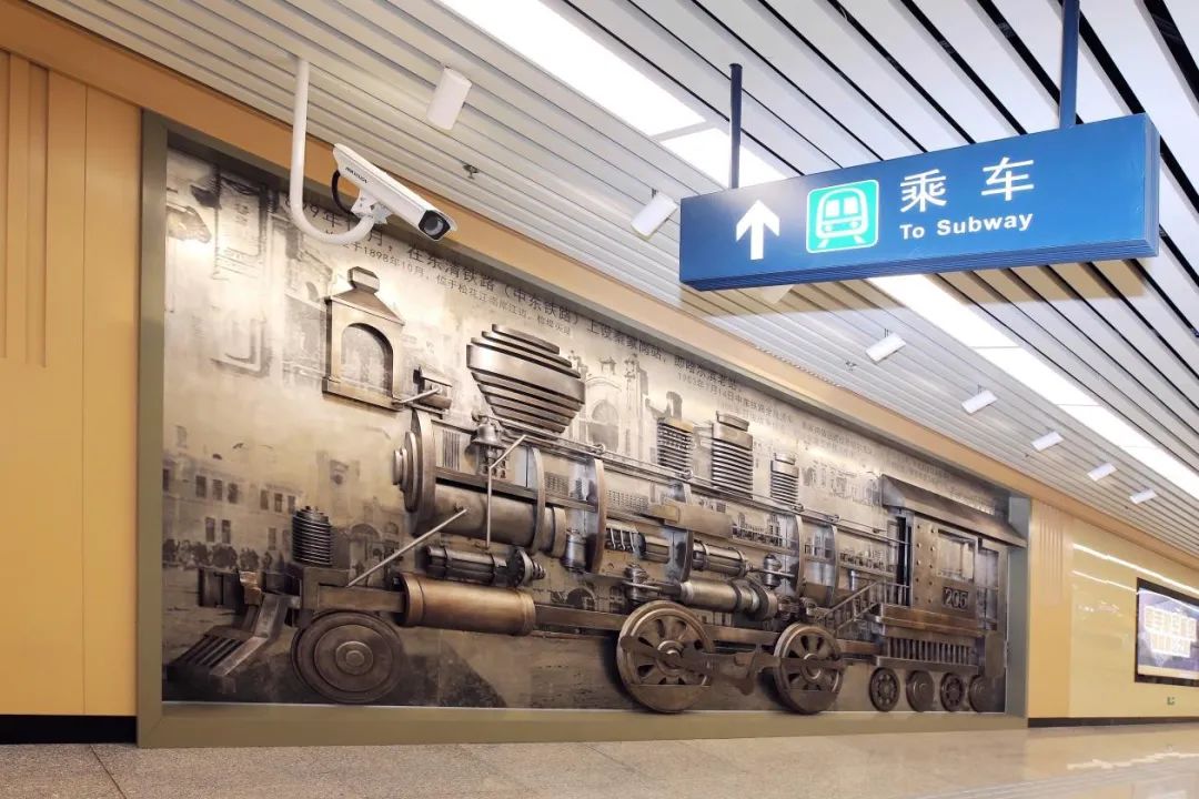 地铁2号线哈尔滨站墙面上的《轮·回》艺术品,以中东铁路时期第一辆火车头(编号205)和新中国成立后第一代“毛泽东号”火车头的造型为设计元素进行创作,背板图像呈现了哈尔滨火车站4次站房改造工程的珍贵图片与文字资料,车辆上斑驳的痕迹犹如一部凝固的城市时间简史,承载了一座城市的百年记忆。
