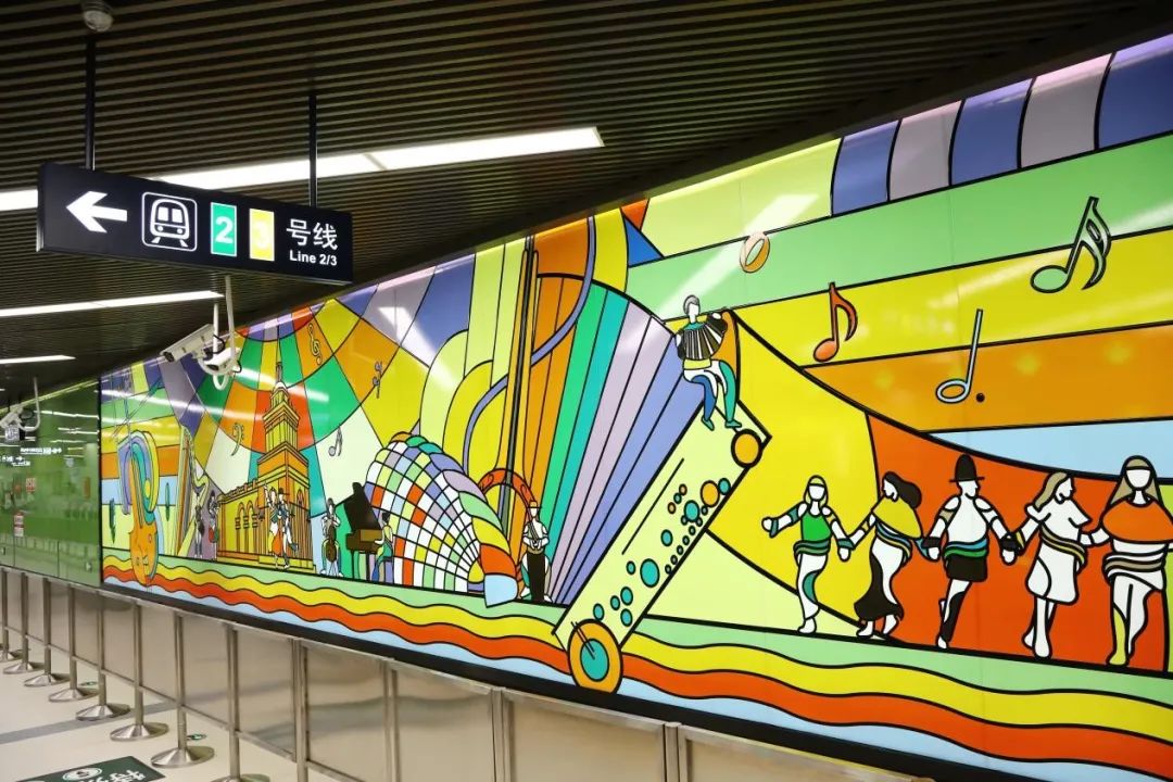 人民广场站《江堤漫影·幸福之声》艺术品,在设计上将传统与现代的器乐交织,将地标建筑屹立于画面之中。五线谱跃然纸上,音符随声飞舞,将管乐器、弦乐器、键盘乐器、满族八角鼓等西洋和民族乐器融汇其中,人们在音乐声中载歌载舞,享受着江畔的微风与美景,展示哈尔滨音乐之城的魅力和社会主义新时代生活的美好画面。