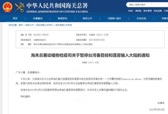海关总署网站9月18日发布通知,决定自2021年9月20日起暂停台湾地区番荔枝和莲雾输入大陆。