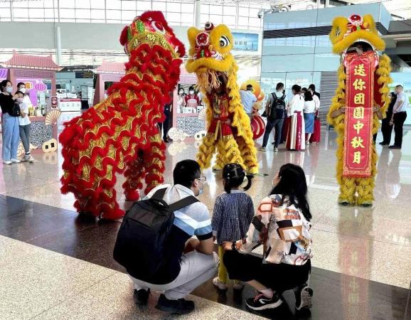 【喜气洋洋度中秋】中秋假期,天津滨海国际机场航站楼引入舞狮、锣鼓、卡通等互动活动,把节日的祝福送给过往的乘客。