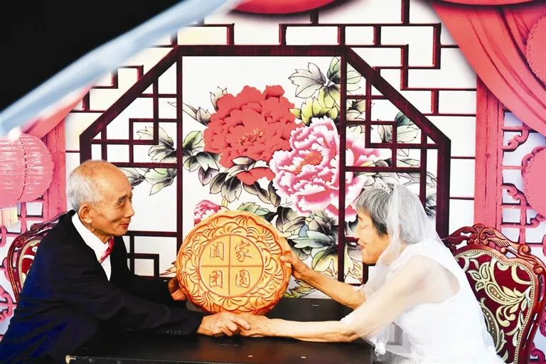 【拍婚纱照庆团圆】中秋节前夕,在河北区新开河街盛华嘉园社区日间照料中心,志愿者给老人化妆、挑选婚纱,用相机定格下美好的团圆时光。