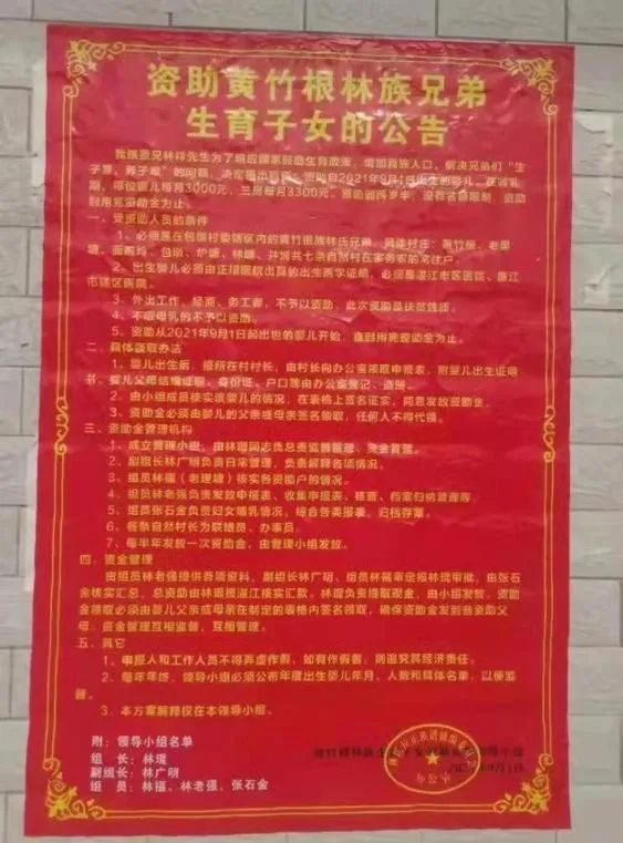 村民每生育一个小孩,重奖9万元!2021年9月1日,广东廉江市革命老区营仔镇包墩村委黄竹根自然村贴出的这一公告,瞬间传遍近乡四邻,犹“炸开了锅”……