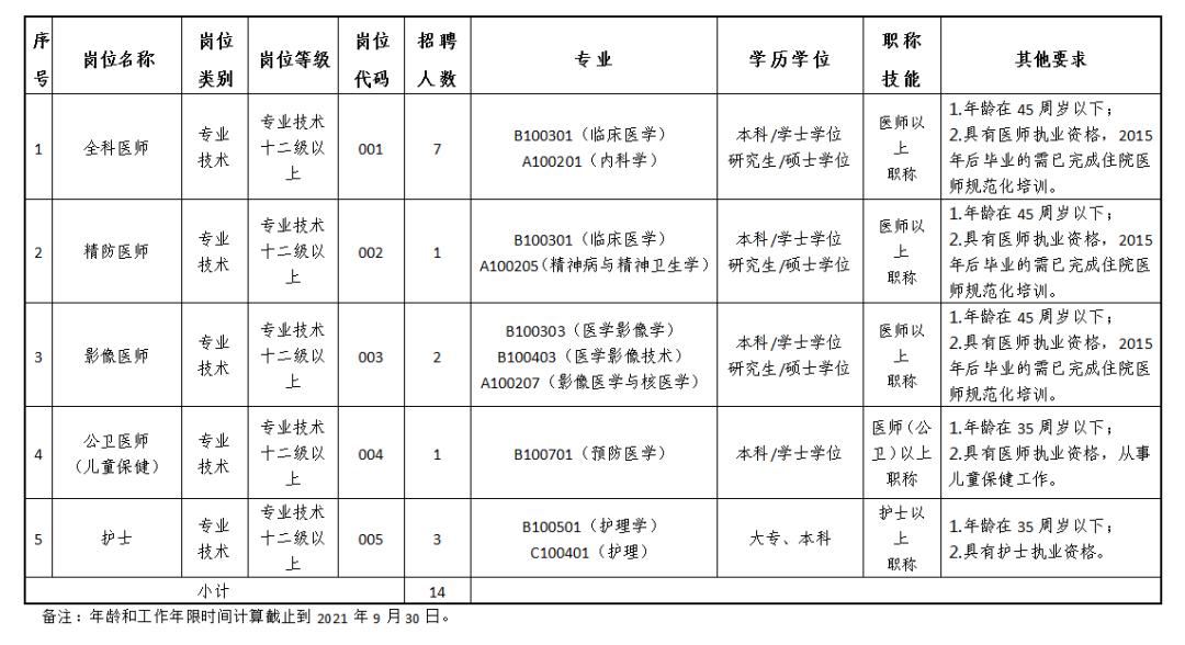 本次招聘全科医师岗位7人,公卫医师岗位1人,精防医生岗位1人,影像医师岗位2人,护士岗位3人,具体岗位情况和要求见岗位表: