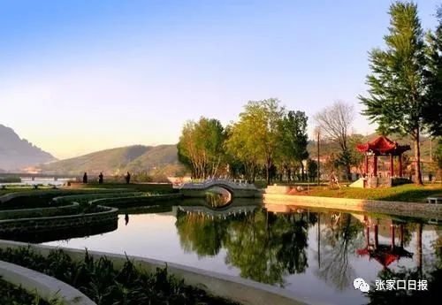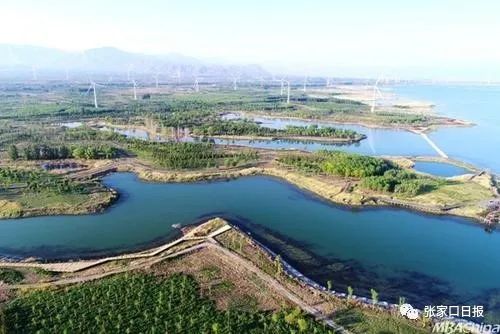 总面积10平方公里,分为湖滨游览区、自然逸趣岛、滨河娱乐区、农业观光区、千足丛林区等,既有塞上雄浑之美,又有江南秀色之柔。生态休闲园内错层叠水、临水木平台、景观平台、彩虹桥、林荫小广场、百米瀑布、三连景观亭、林荫小径、景观叠石等,尽显人间之美景。洋河河谷湿地公园,包括湖滨浏览区,小径通幽、绿树成荫,眼观河水粼波、耳听虫鸟啁鸣,好一派田园胜景!置身千足丛林区,任由心情放飞,任由画中行走,美哉、悠哉,让人流连忘返。张北大营滩省级湿地公园和三台河省级湿地公园