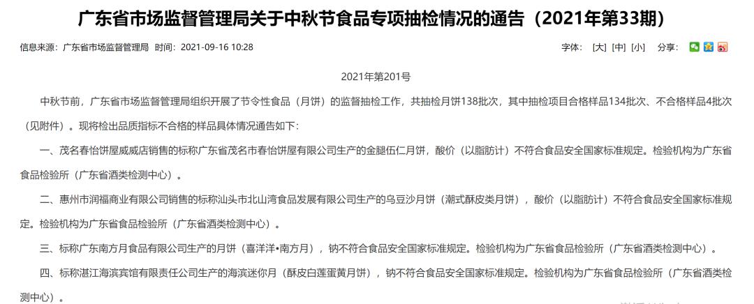 近日,广东省市场监督管理局在官网发布《广东省市场监督管理局关于中秋节食品专项抽检情况的通告(2021年第33期)》。中秋节前,广东省市场监督管理局组织开展了节令性食品(月饼)的监督抽检工作,共抽检月饼138批次,其中抽检项目合格样品134批次、不合格样品4批次。