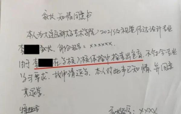 大连医科大学提供给小李的《家长知情同意书》模版中,告知了学校强制小李退学的原因,“由于李某某在学校入校体检中检查出色盲,不符合专业学习要求,故申请退学。”当然,这个申请是学校强制要求的。