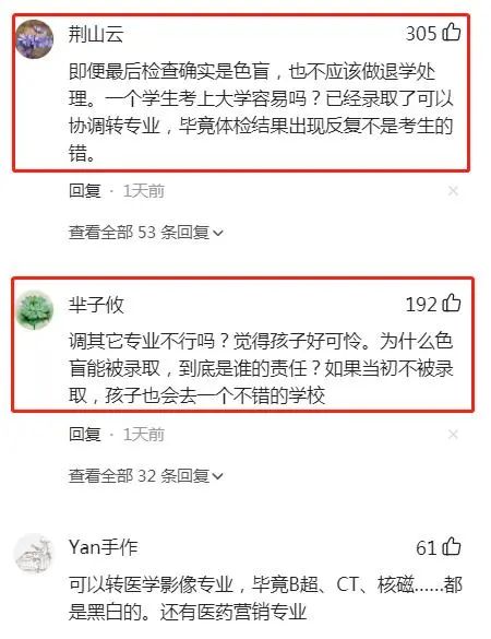 和网友芈子攸:调其它专业不行吗?觉得孩子好可怜。为什么色盲能被录取,到底是谁的责任?如果当初不被录取,孩子也会去一个不错的学校