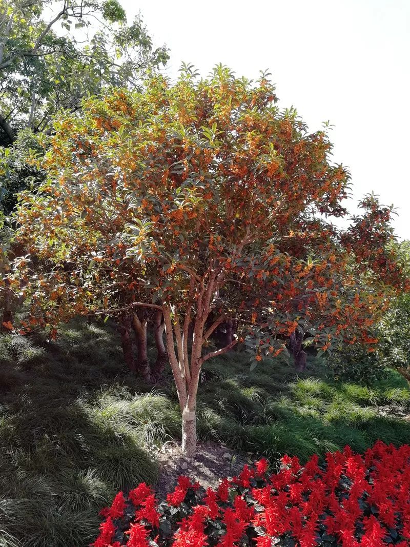 桂花终年常绿、枝繁叶茂、秋季开花。桂花香清新可人、耐人寻味,可谓“独占三秋压群芳”。古代诗歌里也常出现歌颂桂花的诗句:“桂子月中落,天香云中飘”,可见古人也对桂花情有独钟。