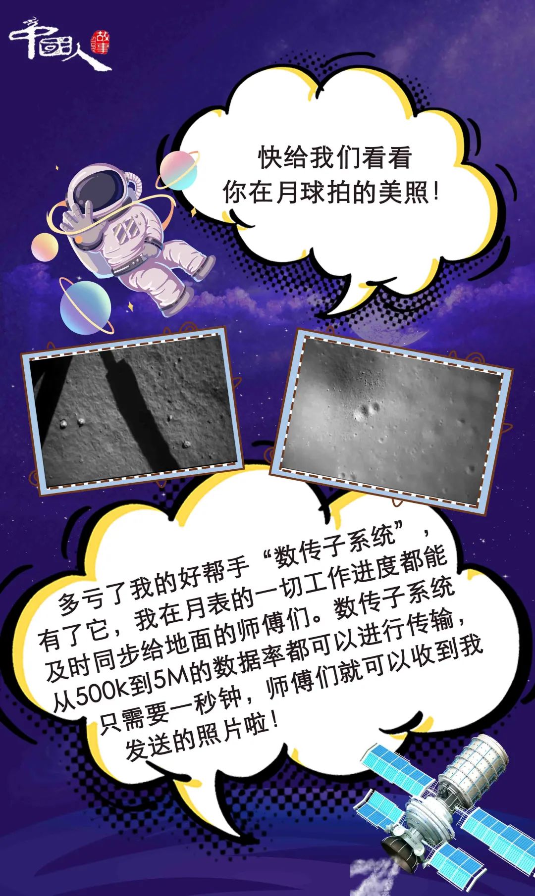去一趟月球不容易,出发前,我们就叮嘱你一定要多拍些照片,工程师叔叔阿姨们也为爱拍照的你准备了相机。为了能方便你及时传输照片,与我们共享月球的神秘风貌,西安分院的叔叔阿姨们在你的相机上装了一个好帮手——数传子系统。当你着陆在月球表面的时候,数传子系统就开始工作了,它会将你拍摄的着陆画面以及数据信息实时传回地面,便于我们帮你分析环境,及时做出判断。