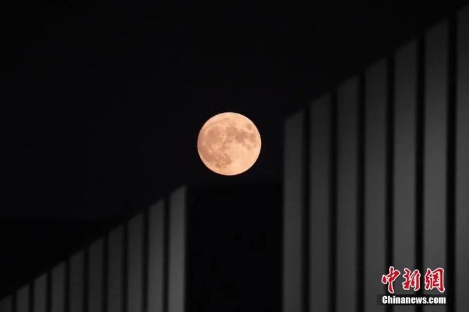 资料图:农历八月十五中秋节,圆月与北京的现代建筑相映成趣。中新社记者 盛佳鹏 摄