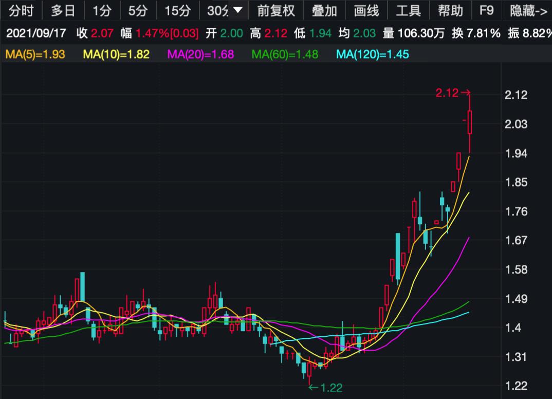 谁知在此后的一个多月时间里,这只股票先后拉出9个涨停板,于9月17日一度摸高至2.12元,累计涨幅高达74%,最终收于2.07元。