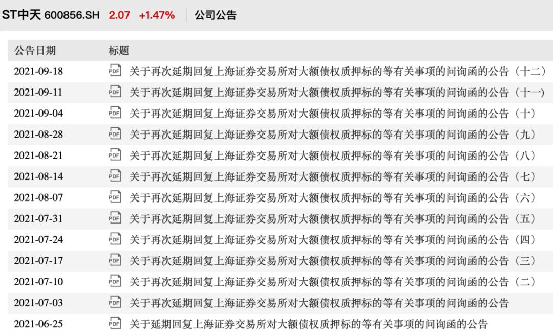 然而上交所并未在5个交易日的限期内收到ST中天的回复。从6月25日到9月18日,ST中天接连发布13份公告,表示要延期回复上述问询函。