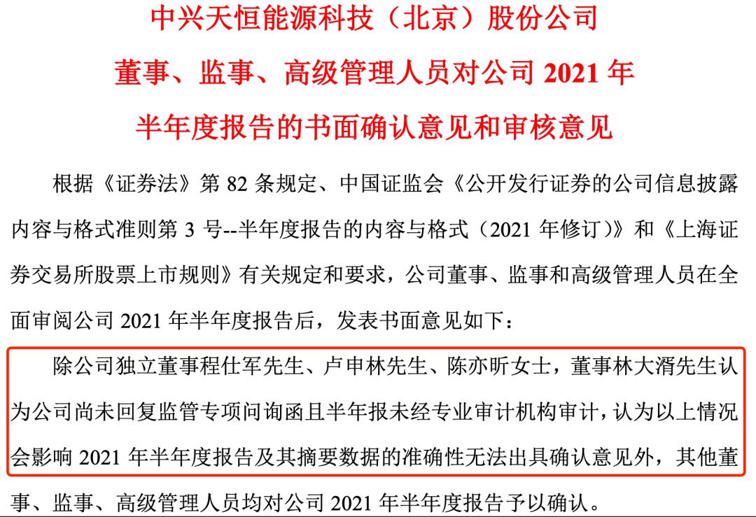 8月30日,ST中天的3位独立董事程仕军、卢申林、陈亦昕,以及董事林大湑认为,该公司尚未回复监管专项问询函且半年报未经专业审计机构审计,会影响2021年半年度报告及其摘要数据的准确性,故对其半年报“无法出具确认意见”。
