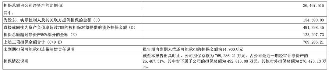 根据半年报,ST中天担保总额高达77亿元,占净资产的比例为26467.51%。其中,直接或间接为资产负债率超过70%的被担保对象提供的债务担保金额最高为49.14亿元;为股东、实际控制人及其关联方提供担保的金额为1.55亿元。