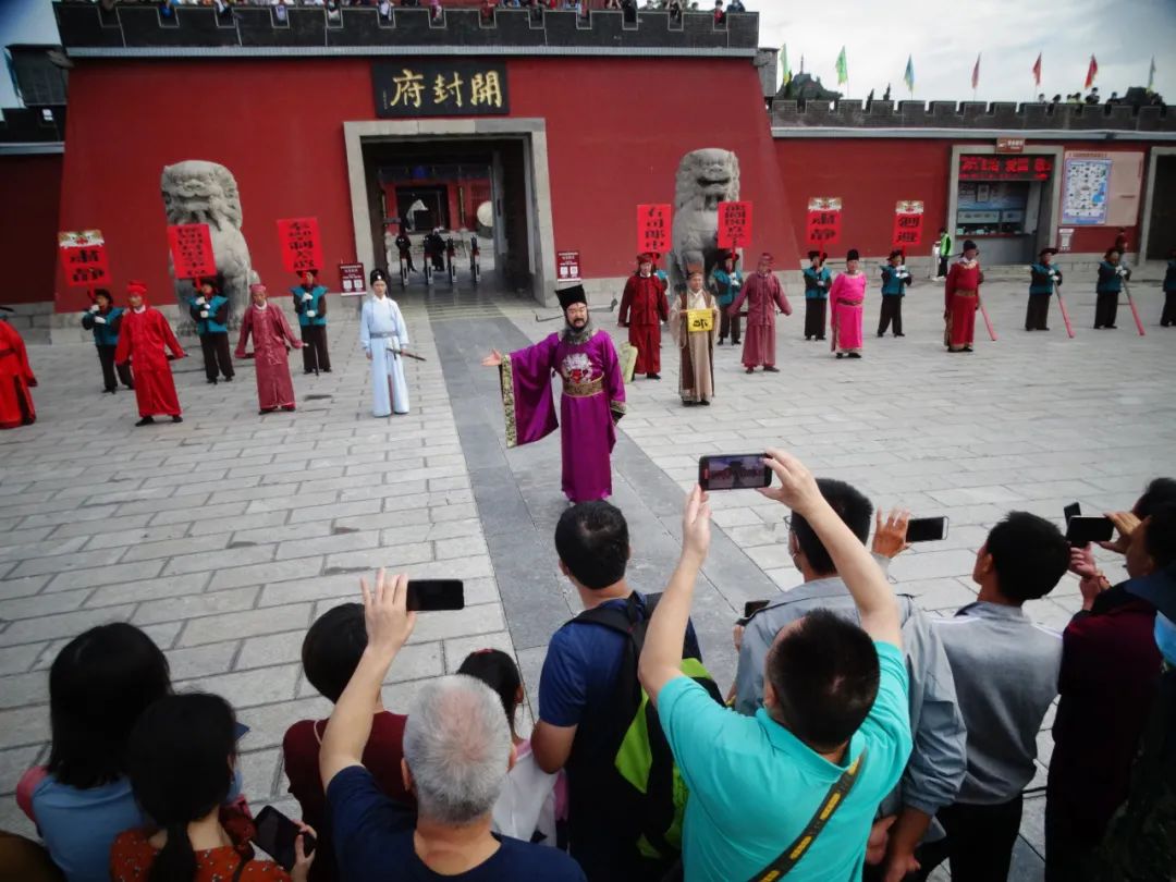 9月21日,开封府景区门前,随着开衙音乐的响起,包大人率众衙役走出府门,迎接八方宾朋。现场,包大人与游客互动,送月饼,送祝福,看包大人断案,赏府内美景,看精彩演出,八方宾朋与包大人一起欢度中秋佳节。