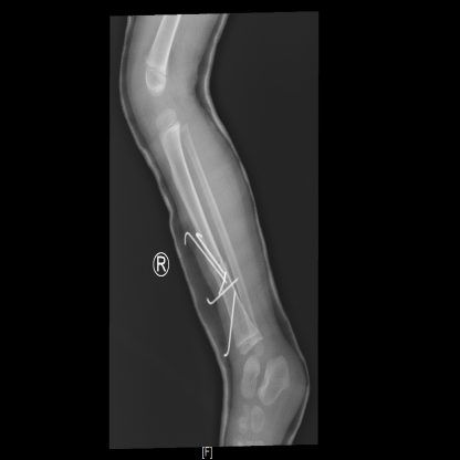 术后给予患儿儿童骨折优质护理,止血及消肿治疗,抬高患肢,注意观察患肢末梢血运。复查X线示:右侧胫腓骨可见外固定影,右胫骨下段可见金属内固定,断端对位对线可,周围未见明确骨痂形成。小曹病情平稳,向患儿家属交代病情及出院注意事项,现已顺利出院。