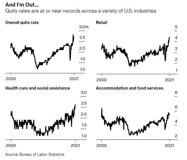 劳工统计局的数据显示,在某些部门和工作类型中,离职情况越来越严重,医疗保健和零售业的辞职率达到了历史最高水平。